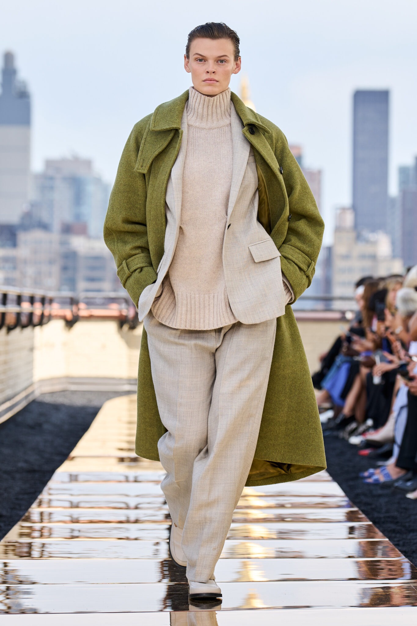 Atenția la materialele folosite se simte în faptul că peste 92% din colecție este realizată din materiale sustenabile. Cașmirul natural, nevopsit, este introdus în asociere cu costume neutre. Paltoanele clasice au inspirație utilitară și vin în tipare oversize, fiind realizate din piele, stofă și tweed, transformând astfel piesele de zi cu zi. Gențile sunt din piele de cactus, am scris aici despre acest material și despre designerul român care îl folosește.