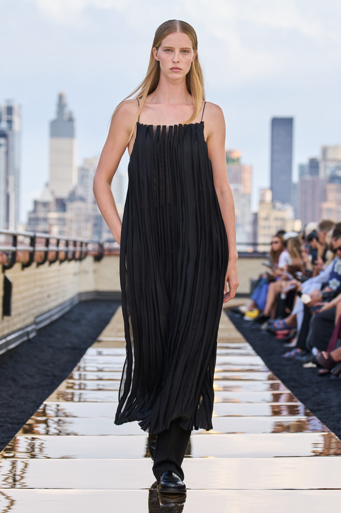 COS a prezentat pentru prima dată la New York piese elegante, de ocazie, fiecare concentrându-se pe o calitate impecabilă. Dezvoltat în atelierul propriu al COS, costumul din două piese cu fustă folosește paiete 100% reciclate.