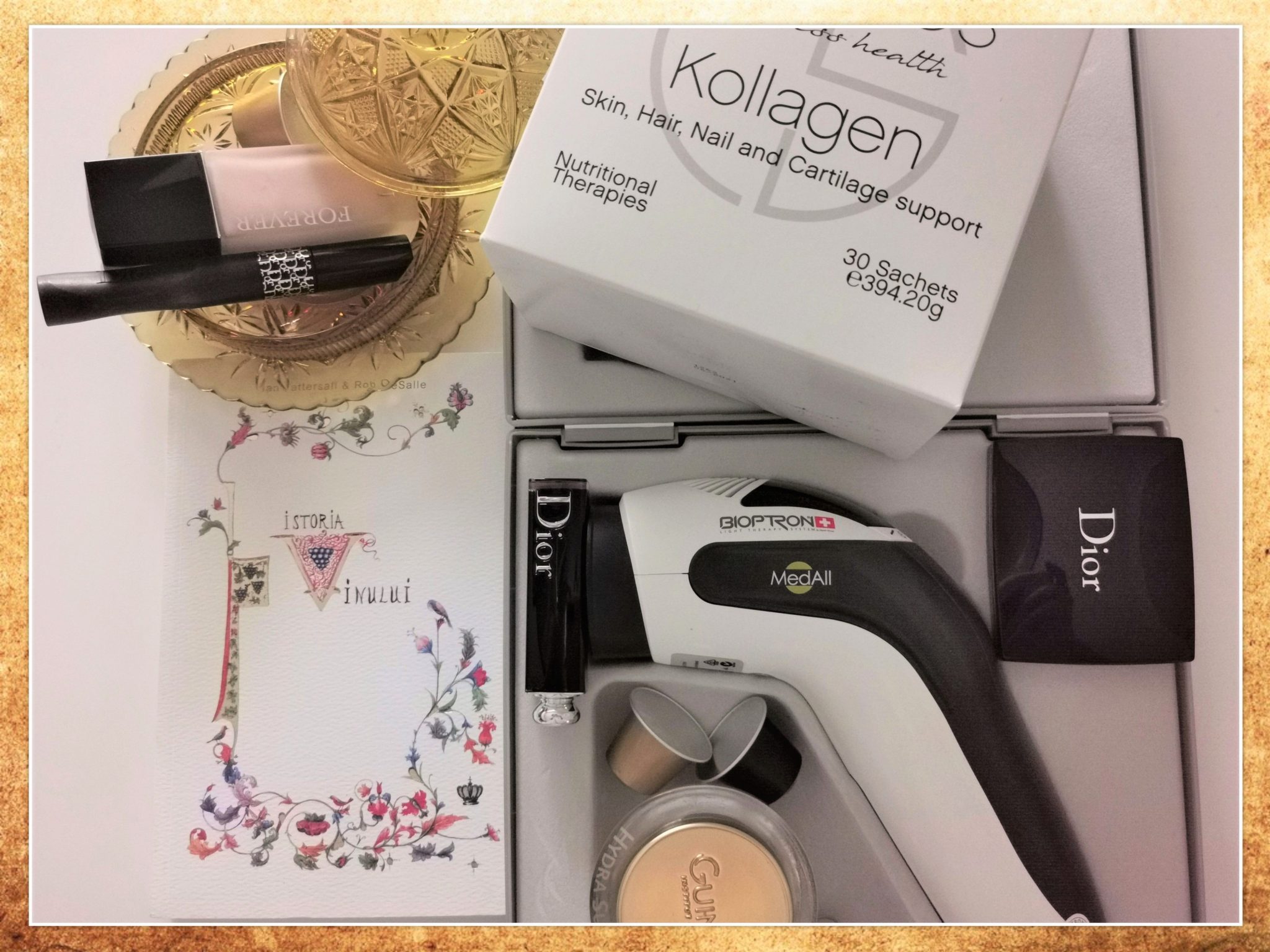 În imagine: capsule Nespresso, fond de ten, mascara, trusă fard ochi, ruj -toate Dior, Bioptron de la Zepter, Kollagen de la Cronos Med, cartea Istoria vinului de la editura Baroque Books&Arts, cremă de față Guinot.
