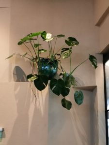 Mi-a arătat azi din nou mesele din lemnul cel gros și mi-a povestit și despre planta, prima de la care a pornit totul, cea din imaginea de mai jos, care era doar o frunză când a luat-o la birou.