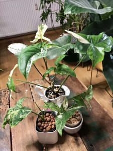 Tot aici am băgat și trei Syngoniumi, doi podophyllum albo variegatum și un mottled arrowhead mojitoPhilodendronul melanochrysum (care a dat o frunză cu error în vechiul cabinet și m-am gândit că o schimbare de peisaj i-ar prinde bineJ), un pui de Philodendron atabapoense care-mi dă niște emoții as we speakJ, pe Philodendronu’ verrucosum ajuns mai pe la începutul toamnei cu toate frunzele bușite, dar și pe amărâtu’ de Philodendron plowmanii wetstick, care a renăscut precum pasărea Phoenix din propria-i cenușă și despre care m-am tot lăudat că vă povestesc, da’ n-am făcut-o.