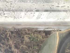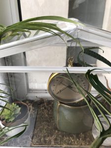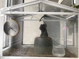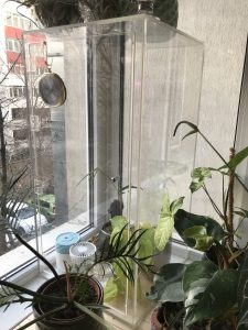 Așa că, destul de repede, adică la început de noiembrie, l-am mutat într-o minisera Ikea – cu tot cu baza de lecca și mușchi, plus un higrometru, o carnivoră pentru eventualele musculițe și un borcan mic umplut cu apă în care am dizolvat o pastilă de CO2 – și am amplasat “mise en place-ul” printre multe alte plante, într-un colț de balcon închis (pentru că, nu-i așa?, la fel ca tot românu’ care trăiește la bloc comunist, și noi avem balconul închis cu termopane, parte integrantă a livingului), poziționat pe est.