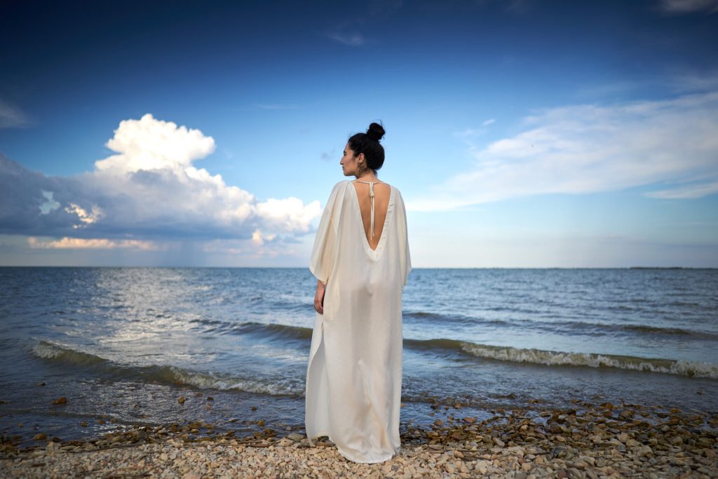 Pentru că am vrut să fac cum făcea ea, adică sustenabil (fără să știe că asta va de veni un stil mai târziu) luând capete de linii și materiale care prisoseau altora, anul trecut am colindat mai multe depozite căutând materiale organice, naturale, care să „cadă” bine. E necesar un astfel de material care să nu încarce nici produsul, nici prețul, pentru că ideea este ca femeile să-și poată permite să cumpere un caftan.