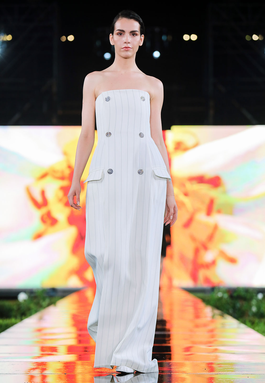 O piesă inspirată din seria construcțiilor de tipar clasic masculine – double breasted jacket, dar transpusă în ceea ce intră în categoria rochiilor cu corset. Totul simplificat până la esență.
