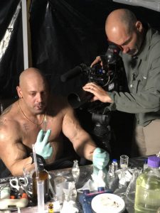 Sacramento, CA – Crew member (R) films Trevor making testosterone in an underground steroids lab. (Credit: National Geographic)