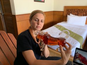 Chiang Saen, Thailand- Mariana van Zeller examines a tiger-shaped bottle filled with what an undercover investigator believes to be tiger wine. (Credit: National Geographic)