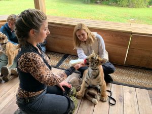 Myrtle Beach, SC- Mariana van Zeller (R) interacts with a tiger cub and a Myrtle Beach Safari handler. (Credit: National Geographic)