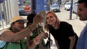 Lima, Peru – Mariana van Zeller (second from right) talking with street-side money exchangers in Lima, Peru. (National Geographic)