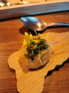 Am început cu ciulinele de Bărăgan făcut dintr-o țesătură din crisp de cartof care necesită multă prelucrare. În interior am pus smântână afumată și am folosit și praf de leurdă pentru a-i da o aromă de usturoi. Pentru Banat am folosit o sărmăluță cu pește din clisura Dunării. Și m-am inspirat de la Radu Anton Roman pentru că el are povești legate de mâncare și de felul în care ea a fost concepută, nu vorbește neapărat de tehnică și rețetă.